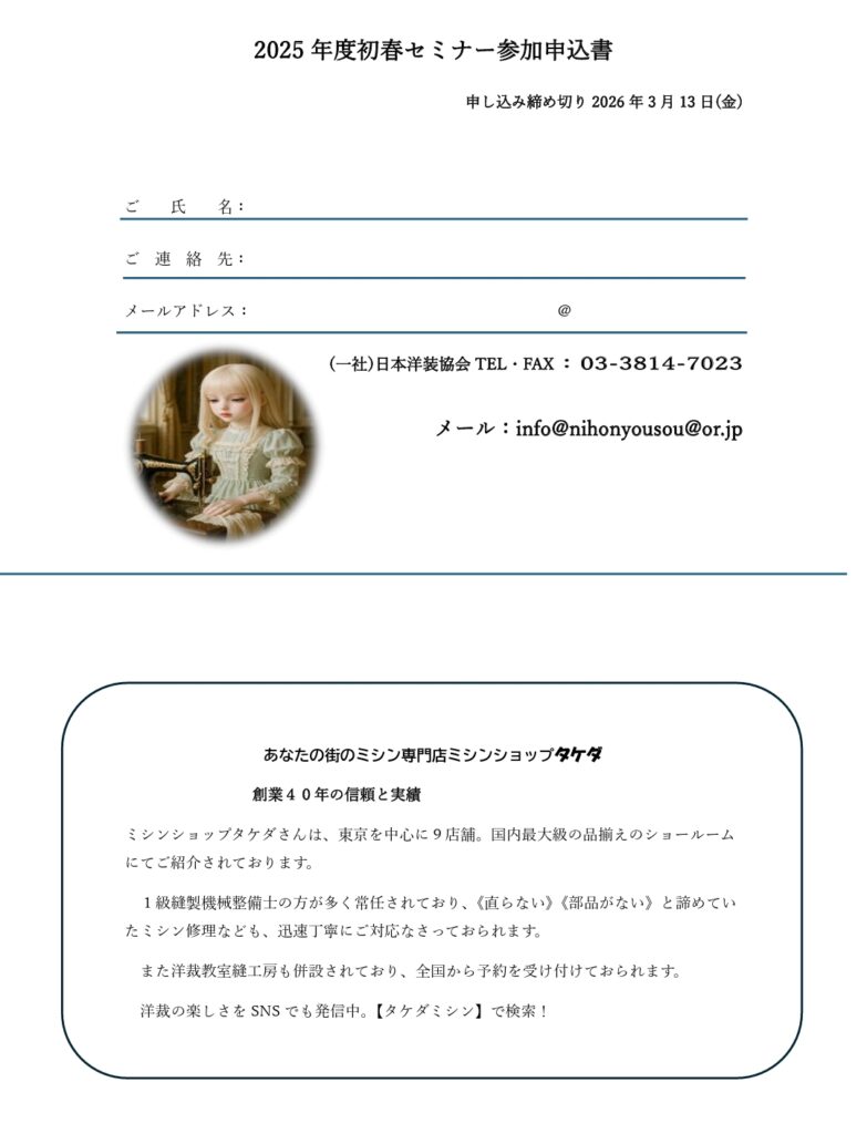 東京洋服会館3階ジェントリーホールにて職業用ミシン・ロックミシンのメンテナンスやアタッチメントの活用法についての講習を開催いたします